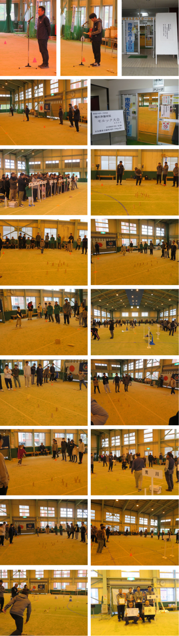 毎月第二日曜日は、市民スポーツの日 令和7年11月9日(日)午前9時30分より小矢部市立屋内スポーツセンターにおいて地区体協対抗モルック大会が、昨年までのカローリング競技より変更し開催しました。 15地区体協に参加いただき、参加人数100名、1チーム6人制で予選リーグ、敗者復活戦、決勝戦等が行われました。